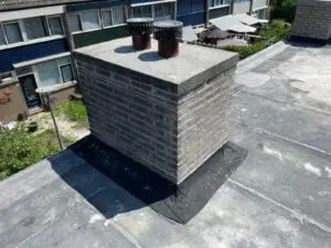 Wij hebben de verzadigde voegen verwijderd en deze opnieuw gevoegd met Beamix voegmortel. Het lood hebben wij vervangen voor de Ubiflex loodvervanger, wat de levensduur van een gebouw mee kan gaan. Daarna is de schoorsteen geïmpregneerd.