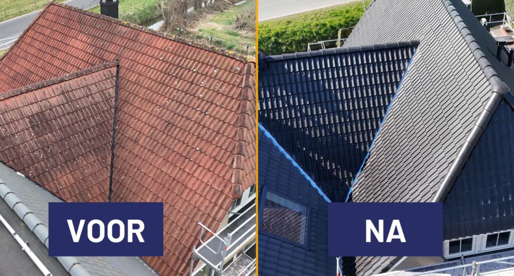 Om een optimale ventilatie te garanderen, is de ruiterbalk verhoogd en is er een Optivent ondervorstsysteem aangebracht. Dit zorgt voor een waterdichte nokafwerking en voorkomt vochtproblemen op lange termijn. Aansluitend zijn nieuwe nokvorsten in bijpassende kleur geplaatst en is het dak opnieuw gereinigd.