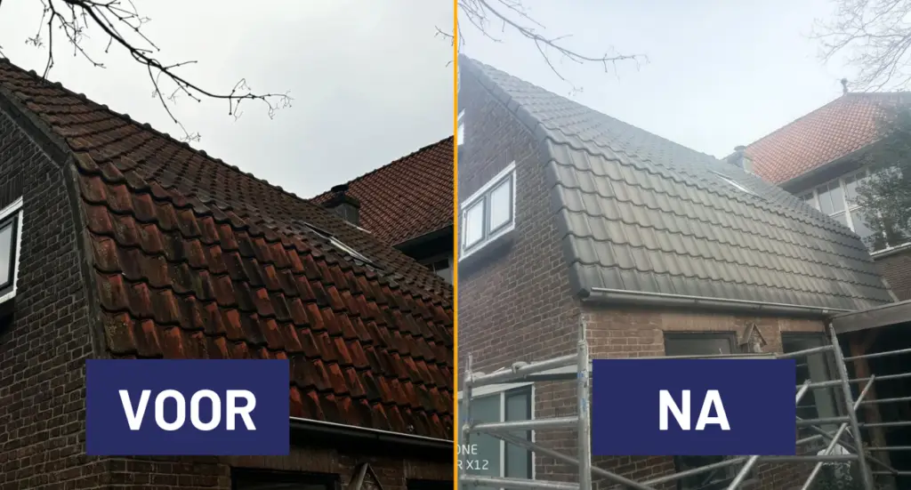 Daarna werd dampremmende dakfolie aangebracht (Polytex of Miofol), gevolgd door het nauwkeurig plaatsen van nieuwe tengels en panlatten. Om een goed ventilerende nok te garanderen, is de ruiterbalk verhoogd volgens de geldende norm. Voor de afwerking zijn blauw gesmoorde VHV dakpannen geplaatst, in combinatie met een Optivent ondervorst die beschermt tegen waterinfiltratie en zorgt voor optimale ventilatie. Tot slot zijn de nieuwe nokvorsten in bijpassende kleur gemonteerd en werd het dak opnieuw gereinigd.